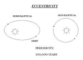 - Eccentricity: the earths orbit changes shape to become more elliptical over a period of 100,000 years. At present the eccentricity is almost at a minimum with a difference of around 6% in received radiation between January and July. At maximum eccentricity this difference increases to between 20% and 30%, which has a massive effect on climate.